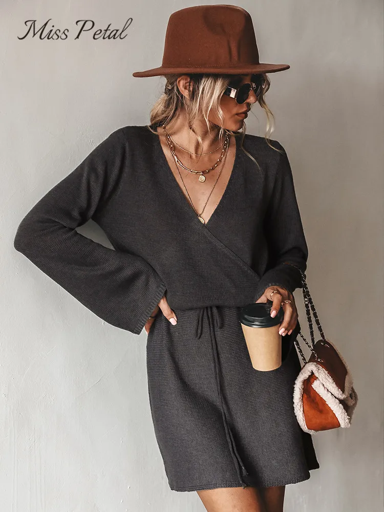 Drawstring Sweater Dress For Women Casual Loose V neck Long Sleeve